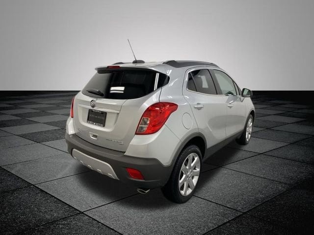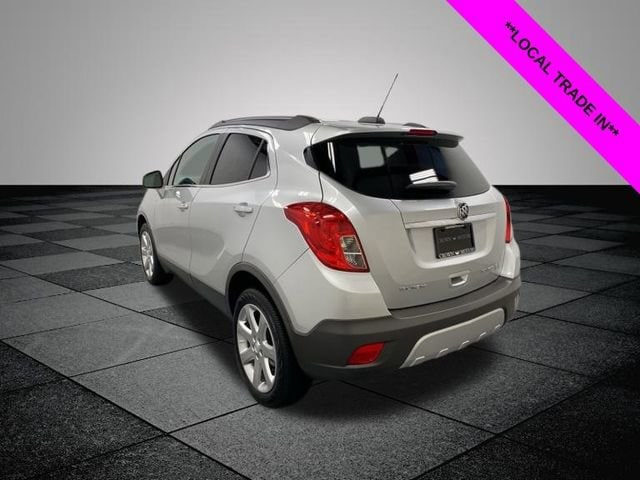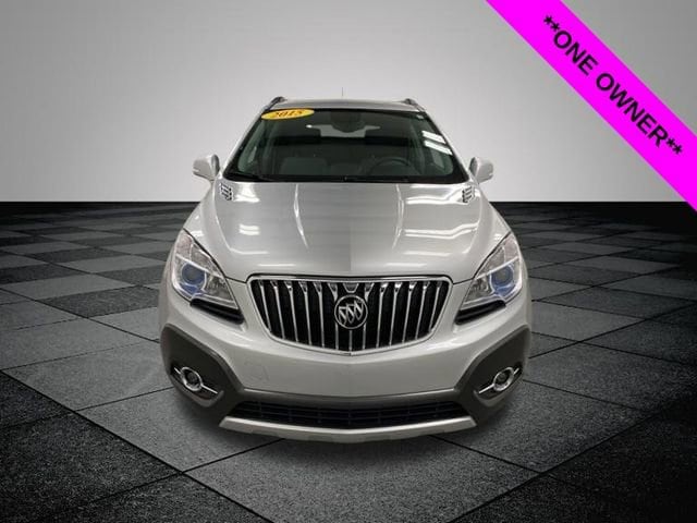 CARFAX One-Owner. Quicksilver Metallic 2015 Buick Encore Leather AWD 6-Speed Automatic Electronic with Overdrive ECOTEC 1.4L I4 SMPI DOHC Turbocharged VVT **ONE OWNER**, ** LOW MILES**, **LOCAL TRADE IN**, AWD, 3.53 Final Drive Axle Ratio, 4-Wheel Disc Brakes, 6 Speakers, 6-Way Power Driver Seat Adjuster, 6-Way Power Front Passenger Seat Adjuster, ABS brakes, Air Conditioning, Alloy wheels, AM/FM radio: SiriusXM, Auto-dimming Rear-View mirror, Automatic temperature control, Brake assist, Bumpers: body-color, CD player, Compass, Delay-off headlights, Driver door bin, Driver vanity mirror, Driver's Seat Mounted Armrest, Dual front impact airbags, Dual front side impact airbags, Electronic Stability Control, Emergency communication system: OnStar Directions & Connections, Experience Buick Package (DISC), Exterior Parking Camera Rear, Front & Rear All Weather Floor Mats (LPO), Front anti-roll bar, Front Bucket Seats, Front dual zone A/C, Front fog lights, Front reading lights, Front wheel independent suspension, Fully automatic headlights, Heated door mirrors, Heated Driver & Front Passenger Seats, Heated front seats, Heated steering wheel, Illuminated entry, Knee airbag, Leather steering wheel, Leather-Appointed Seat Trim, Low tire pressure warning, Memory seat, Occupant sensing airbag, Outside temperature display, Overhead airbag, Panic alarm, Passenger door bin, Passenger vanity mirror, Power door mirrors, Power driver seat, Power passenger seat, Power steering, Power Tilt-Sliding Moonroof, Power windows, Preferred Equipment Group 1SL, Premium audio system: IntelliLink, Radio data system, Radio: AM/FM Audio System w/MP3 CD Player, Radio: AM/FM Audio System w/Nav/Single CD Player, Rear seat center armrest, Rear side impact airbag, Rear window defroster, Rear window wiper, Remote keyless entry, Ride & Handling Suspension, Roof rack: rails only, Security system, SiriusXM Satellite Radio, Speed control, Speed-sensing steering, Split folding rear seat, Spoiler, Steering wheel mounted audio controls, Tachometer, Telescoping steering wheel, Tilt steering wheel, Traction control, Trip computer, Turn signal indicator mirrors, Variably intermittent wipers, Wheels: 18" 5-Spoke Painted Cast Aluminum, Wheels: 18" 7-Spoke Painted Cast Aluminum, Wheels: 18" Chromed Aluminum (DISC), AWD.
