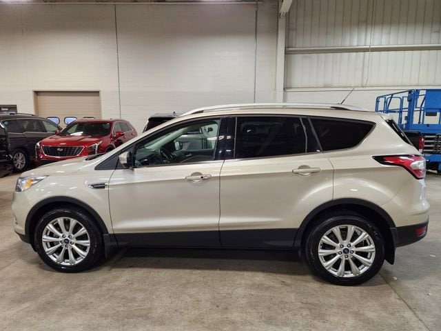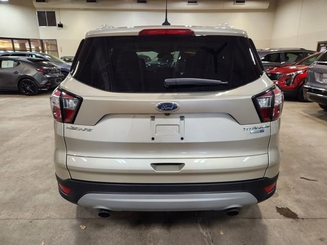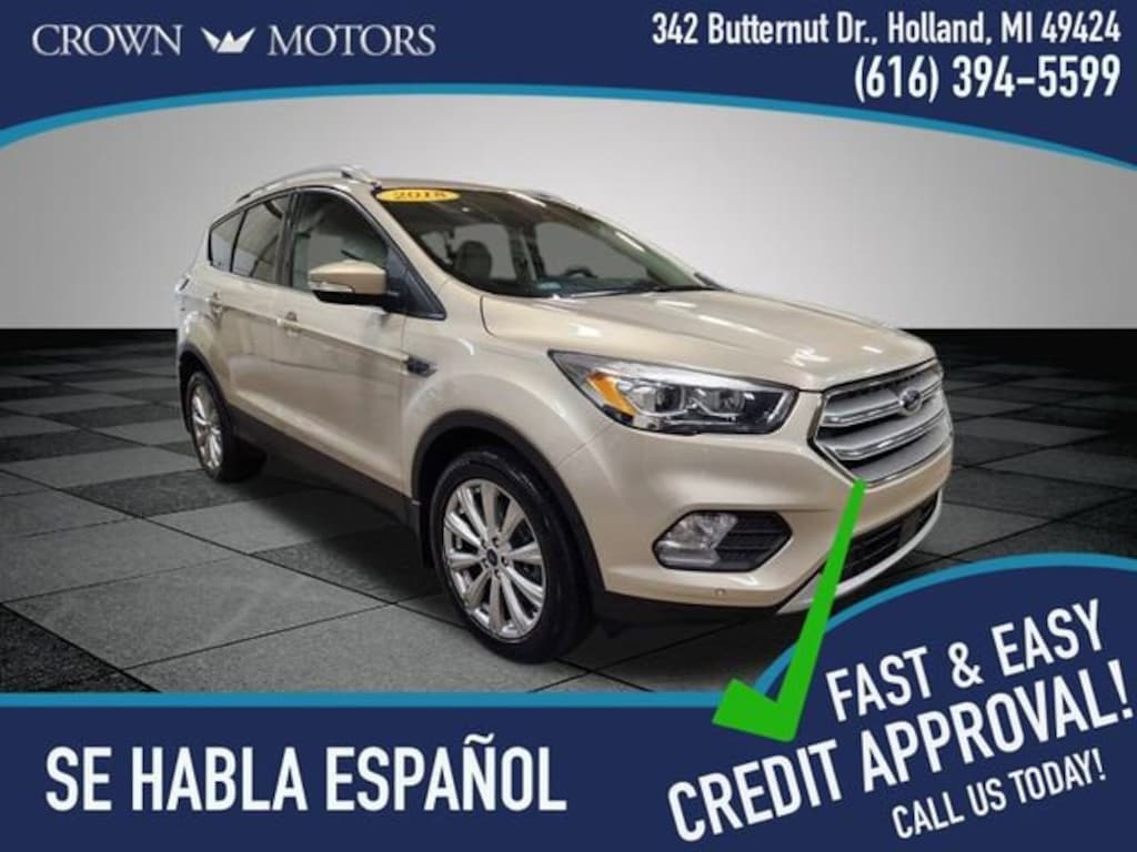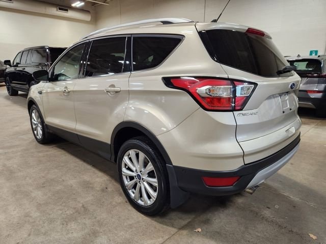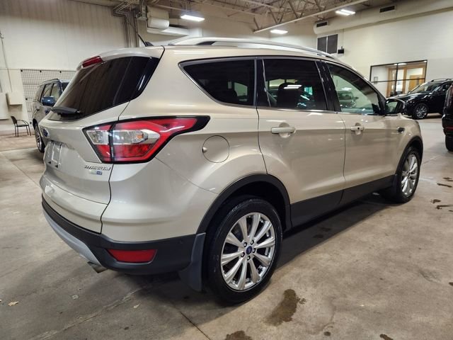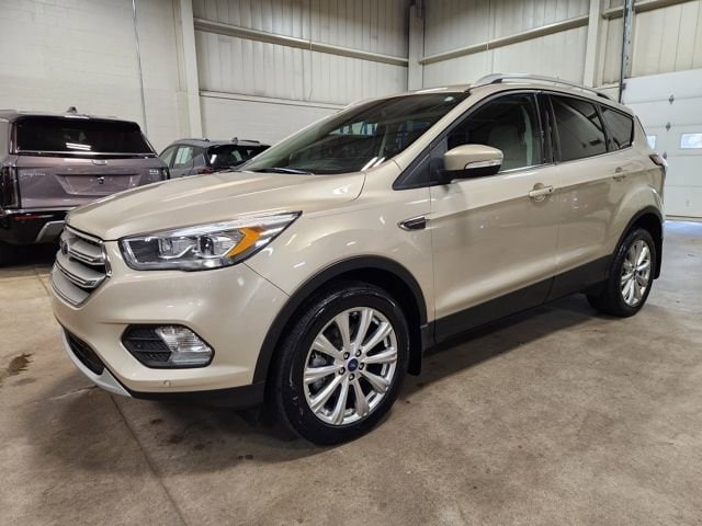 CARFAX One-Owner. White Gold 2018 Ford Escape Titanium 4WD 6-Speed Automatic EcoBoost 2.0L I4 GTDi DOHC Turbocharged VCT **LEATHER**, **LOCAL TRADE IN**, Escape Titanium, 4WD, 10 Speakers, 3.07 Axle Ratio, 4-Wheel Disc Brakes, ABS brakes, Adaptive Cruise Control & Fwd Collision Warning, Air Conditioning, Alloy wheels, AM/FM radio: SiriusXM, AppLink/Apple CarPlay and Android Auto, Auto High-Beam Headlamps, Auto-dimming Rear-View mirror, Automatic temperature control, Blind Spot Info System w/Cross-Traffic Alert, Brake assist, Bumpers: body-color, CD player, Compass, Delay-off headlights, Driver door bin, Driver vanity mirror, Dual front impact airbags, Dual front side impact airbags, Electronic Stability Control, Emergency communication system: SYNC 3 911 Assist, Equipment Group 400A, Exterior Parking Camera Rear, Ford Safe & Smart Package, Four wheel independent suspension, Front anti-roll bar, Front Bucket Seats, Front Center Armrest, Front dual zone A/C, Front fog lights, Front reading lights, Fully automatic headlights, Garage door transmitter, Heated door mirrors, Heated front seats, Heated Leather-Trimmed Front Bucket Seats, Heated steering wheel, High-Intensity Discharge Headlights, Illuminated entry, Knee airbag, Lane-Keeping System, Leather Shift Knob, Low tire pressure warning, Memory seat, Navigation System, Occupant sensing airbag, Outside temperature display, Overhead airbag, Overhead console, Panic alarm, Passenger door bin, Passenger vanity mirror, Power door mirrors, Power driver seat, Power Liftgate, Power passenger seat, Power steering, Power windows, Radio data system, Radio: AM/FM Stereo w/Single-CD/MP3 Player, Rain-Sensing Wipers, Rear anti-roll bar, Rear reading lights, Rear seat center armrest, Rear window defroster, Rear window wiper, Remote keyless entry, Roof rack: rails only, Security system, Speed control, Speed-sensing steering, Split folding rear seat, Steering wheel mounted audio controls, SYNC 3 Communications & Entertainment System, SYNC Connect, Tachometer, Telescoping steering wheel, Tilt steering wheel, Traction control, Trip computer, Turn signal indicator mirrors, Variably intermittent wipers, Voice-Activated Touchscreen Navigation System, Wheels: 18" Sparkle Silver-Painted Aluminum, Escape Titanium, 4WD.