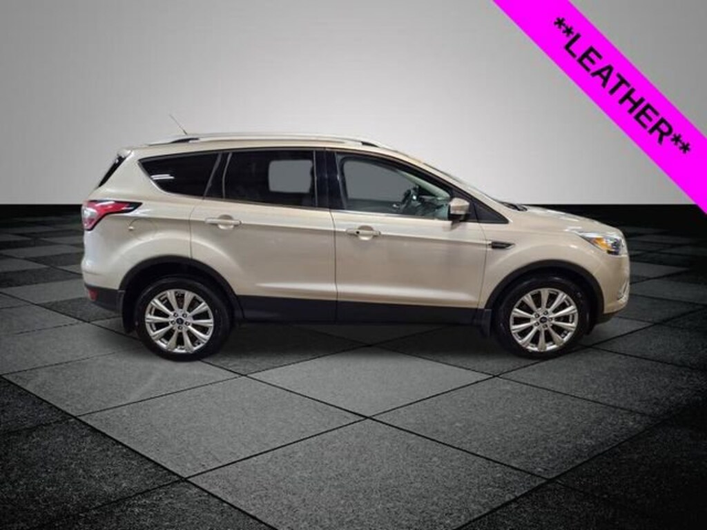CARFAX One-Owner. White Gold 2018 Ford Escape Titanium 4WD 6-Speed Automatic EcoBoost 2.0L I4 GTDi DOHC Turbocharged VCT **LEATHER**, **LOCAL TRADE IN**, Escape Titanium, 4WD, 10 Speakers, 3.07 Axle Ratio, 4-Wheel Disc Brakes, ABS brakes, Adaptive Cruise Control & Fwd Collision Warning, Air Conditioning, Alloy wheels, AM/FM radio: SiriusXM, AppLink/Apple CarPlay and Android Auto, Auto High-Beam Headlamps, Auto-dimming Rear-View mirror, Automatic temperature control, Blind Spot Info System w/Cross-Traffic Alert, Brake assist, Bumpers: body-color, CD player, Compass, Delay-off headlights, Driver door bin, Driver vanity mirror, Dual front impact airbags, Dual front side impact airbags, Electronic Stability Control, Emergency communication system: SYNC 3 911 Assist, Equipment Group 400A, Exterior Parking Camera Rear, Ford Safe & Smart Package, Four wheel independent suspension, Front anti-roll bar, Front Bucket Seats, Front Center Armrest, Front dual zone A/C, Front fog lights, Front reading lights, Fully automatic headlights, Garage door transmitter, Heated door mirrors, Heated front seats, Heated Leather-Trimmed Front Bucket Seats, Heated steering wheel, High-Intensity Discharge Headlights, Illuminated entry, Knee airbag, Lane-Keeping System, Leather Shift Knob, Low tire pressure warning, Memory seat, Navigation System, Occupant sensing airbag, Outside temperature display, Overhead airbag, Overhead console, Panic alarm, Passenger door bin, Passenger vanity mirror, Power door mirrors, Power driver seat, Power Liftgate, Power passenger seat, Power steering, Power windows, Radio data system, Radio: AM/FM Stereo w/Single-CD/MP3 Player, Rain-Sensing Wipers, Rear anti-roll bar, Rear reading lights, Rear seat center armrest, Rear window defroster, Rear window wiper, Remote keyless entry, Roof rack: rails only, Security system, Speed control, Speed-sensing steering, Split folding rear seat, Steering wheel mounted audio controls, SYNC 3 Communications & Entertainment System, SYNC Connect, Tachometer, Telescoping steering wheel, Tilt steering wheel, Traction control, Trip computer, Turn signal indicator mirrors, Variably intermittent wipers, Voice-Activated Touchscreen Navigation System, Wheels: 18" Sparkle Silver-Painted Aluminum, Escape Titanium, 4WD.