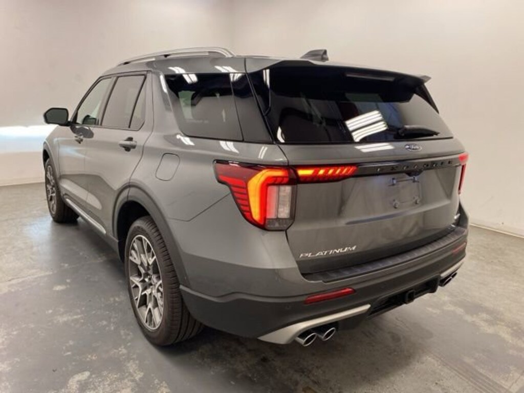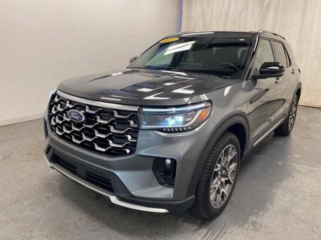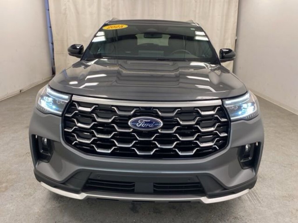 CARFAX One-Owner. Clean CARFAX. Gray Metallic 2025 Ford Explorer Platinum 4WD 10-Speed Automatic 3.0L EcoBoost V6 **ONE OWNER**, ** LOW MILES**, **ACCIDENT FREE**, **LOCAL TRADE IN**, 4WD, 14 Speakers, 3.58 Non-Limited Slip Rear Axle, 3rd row seats: bench, 4-Wheel Disc Brakes, ABS brakes, ActiveX Trimmed Sport Captain's Chairs, Air Conditioning, Alloy wheels, Apple CarPlay/Android Auto, Auto High-beam Headlights, Auto-dimming door mirrors, Auto-dimming Rear-View mirror, Automatic temperature control, Brake assist, Bumpers: body-color, Compass, Delay-off headlights, Driver door bin, Driver vanity mirror, Dual front impact airbags, Dual front side impact airbags, Electronic Stability Control, Emergency communication system: 911 Assist, Equipment Group 600A Standard Package, Exterior Parking Camera Rear, Ford BlueCruise Equipped (1-Year Plan) (DISC), Four wheel independent suspension, Front anti-roll bar, Front Bucket Seats, Front Center Armrest, Front dual zone A/C, Front fog lights, Front reading lights, Fully automatic headlights, Garage door transmitter, Heated door mirrors, Heated front seats, Heated rear seats, Heated steering wheel, Illuminated entry, Knee airbag, Leather Seating Surfaces Sport Captain Chairs, Leather steering wheel, Low tire pressure warning, Lux Leather Package, Memory seat, Navigation System, Occupant sensing airbag, Outside temperature display, Overhead airbag, Overhead console, Panic alarm, Passenger door bin, Passenger vanity mirror, Platinum Badges on Front Row Seats, Power door mirrors, Power driver seat, Power Liftgate, Power moonroof, Power passenger seat, Power steering, Power windows, Quilting & Stitching on Door Panels, Quilting & Stitching on Seats, Radio data system, Radio: B&O Sound System by Bang & Olufsen w/HD, Rain sensing wipers, Rear air conditioning, Rear anti-roll bar, Rear reading lights, Rear window defroster, Rear window wiper, Remote keyless entry, Security system, Speed control, Speed-sensing steering, Speed-Sensitive Wipers, Split folding rear seat, Spoiler, Steering wheel mounted audio controls, Tachometer, Telescoping steering wheel, Tilt steering wheel, Traction control, Trip computer, Turn signal indicator mirrors, Ultimate Package, Variably intermittent wipers, Ventilated front seats, Wheels: 20" Luster Nickel-Painted Aluminum, Wheels: 21" Dark Alloy-Painted Machined Aluminum, 4WD.