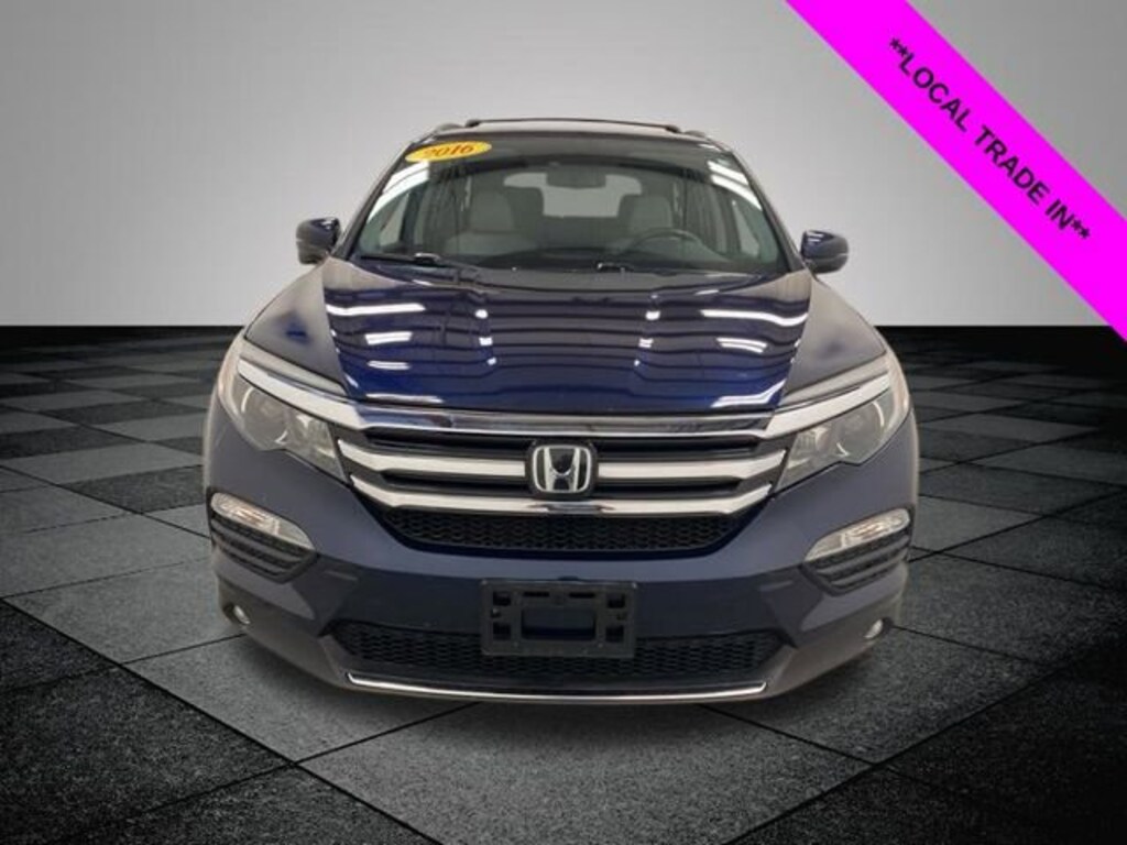 Obsidian Blue Pearl 2016 Honda Pilot Touring AWD 9-Speed Automatic 3.5L V6 24V SOHC i-VTEC **LOCAL TRADE IN**, Pilot Touring, AWD, 10 Speakers, 20" Alloy Wheels, 3rd row seats: split-bench, 4-Wheel Disc Brakes, 4.334 Axle Ratio, A/V remote, ABS brakes, Air Conditioning, Alloy wheels, AM/FM radio: SiriusXM, Auto-dimming Rear-View mirror, Automatic temperature control, Brake assist, Bumpers: body-color, Compass, Delay-off headlights, Driver door bin, Driver vanity mirror, Dual front impact airbags, Dual front side impact airbags, Electronic Stability Control, Emergency communication system: HondaLink Assist, Exterior Parking Camera Rear, Four wheel independent suspension, Front anti-roll bar, Front Bucket Seats, Front Center Armrest, Front dual zone A/C, Front fog lights, Front reading lights, Fully automatic headlights, Garage door transmitter: HomeLink, Headphones, Heated door mirrors, Heated Front Bucket Seats, Heated front seats, Honda Satellite-Linked Navigation System, Illuminated entry, Leather Shift Knob, Leather-Trimmed Seats, Low tire pressure warning, Memory seat, Navigation System, Occupant sensing airbag, Outside temperature display, Overhead airbag, Overhead console, Panic alarm, Passenger door bin, Passenger vanity mirror, Power door mirrors, Power driver seat, Power Liftgate, Power moonroof, Power passenger seat, Power steering, Power windows, Radio data system, Radio: AM/FM Premium Audio System, Rear air conditioning, Rear anti-roll bar, Rear audio controls, Rear reading lights, Rear seat center armrest, Rear window defroster, Rear window wiper, Remote keyless entry, Roof rack: rails only, Security system, SiriusXM Radio, Speed control, Speed-sensing steering, Speed-Sensitive Wipers, Split folding rear seat, Spoiler, Steering wheel mounted audio controls, Tachometer, Telescoping steering wheel, Tilt steering wheel, Traction control, Trip computer, Turn signal indicator mirrors, Variably intermittent wipers, Pilot Touring, AWD.