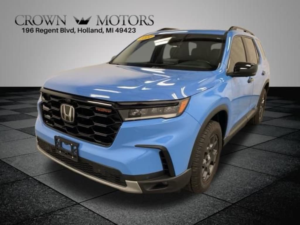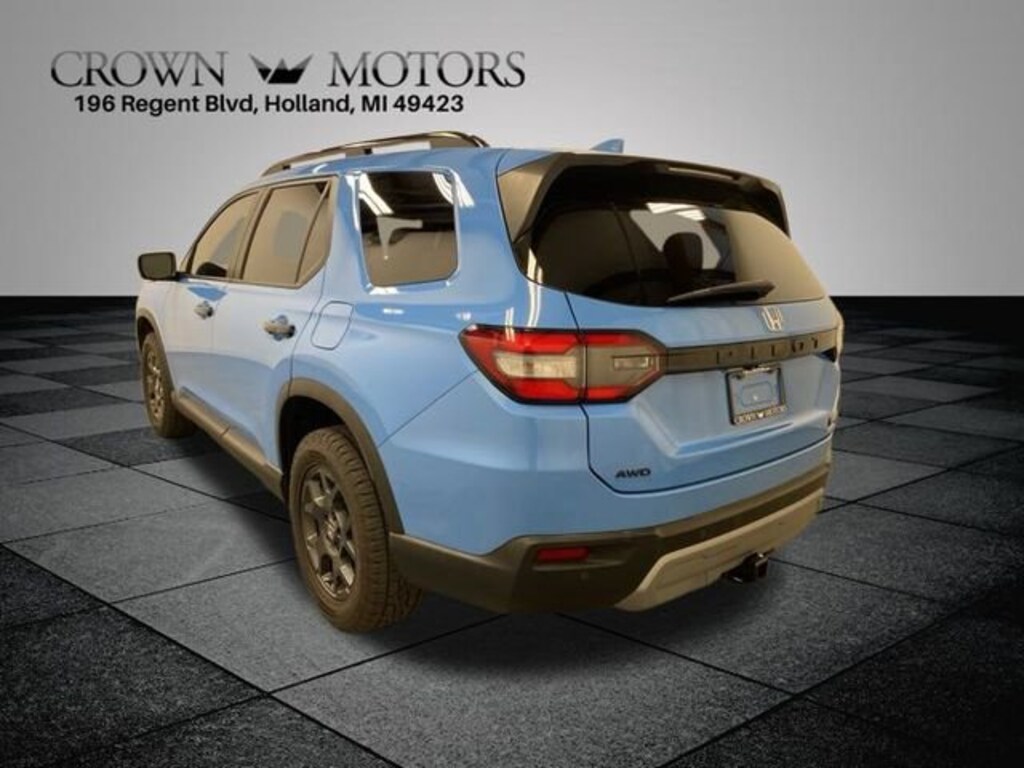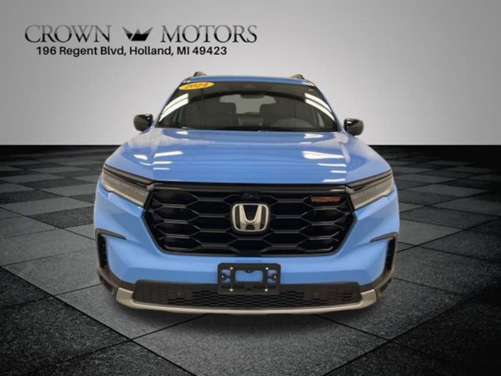 CARFAX One-Owner. Certified. Diffused Sky Pearl 2024 Honda Pilot TrailSport AWD 10-Speed Automatic 3.5L V6 DOHC 24V **ONE OWNER**, **HONDA CERTIFIED**, HondaTrue Certified Certified, AWD, 3rd row seats: split-bench, 4-Wheel Disc Brakes, 9 Speakers, ABS brakes, Adaptive Cruise Control: Adaptive Cruise Control (ACC) with Low-Speed Follow, Air Conditioning, Alloy wheels, AM/FM radio: SiriusXM, Apple CarPlay/Android Auto, Auto High-beam Headlights, Auto-dimming Rear-View mirror, Automatic temperature control, Axle Ratio: 4.167, Blind Spot Information (BSI) System warning, Brake assist, Bumpers: body-color, Delay-off headlights, Driver door bin, Driver vanity mirror, Dual front impact airbags, Dual front side impact airbags, Durable Synthetic Leather Seat Trim, Electronic Stability Control, Emergency communication system: HondaLink Assist, Exterior Parking Camera Rear, Four wheel independent suspension, Front anti-roll bar, Front Bucket Seats, Front Center Armrest, Front dual zone A/C, Front fog lights, Front reading lights, Fully automatic headlights, Garage door transmitter: HomeLink, Heated door mirrors, Heated Front Bucket Seats, Heated front seats, Illuminated entry, Knee airbag, Lane departure: Lane Keeping Assist System (LKAS) active, Low tire pressure warning, Memory seat, Occupant sensing airbag, Outside temperature display, Overhead airbag, Overhead console, Panic alarm, Passenger door bin, Passenger vanity mirror, Power door mirrors, Power driver seat, Power Liftgate, Power moonroof, Power passenger seat, Power steering, Power windows, Radio data system, Radio: 245-Watt Audio System, Rear air conditioning, Rear anti-roll bar, Rear reading lights, Rear window defroster, Rear window wiper, Reclining 3rd row seat, Remote keyless entry, Security system, Speed control, Speed-sensing steering, Speed-Sensitive Wipers, Split folding rear seat, Spoiler, Steering wheel mounted audio controls, Tachometer, Telescoping steering wheel, Tilt steering wheel, Traction control, Trip computer, Turn signal indicator mirrors, Variably intermittent wipers, Wheels: 18" Fully Painted Shark Gray w/Blk Lug Nuts, AWD.
