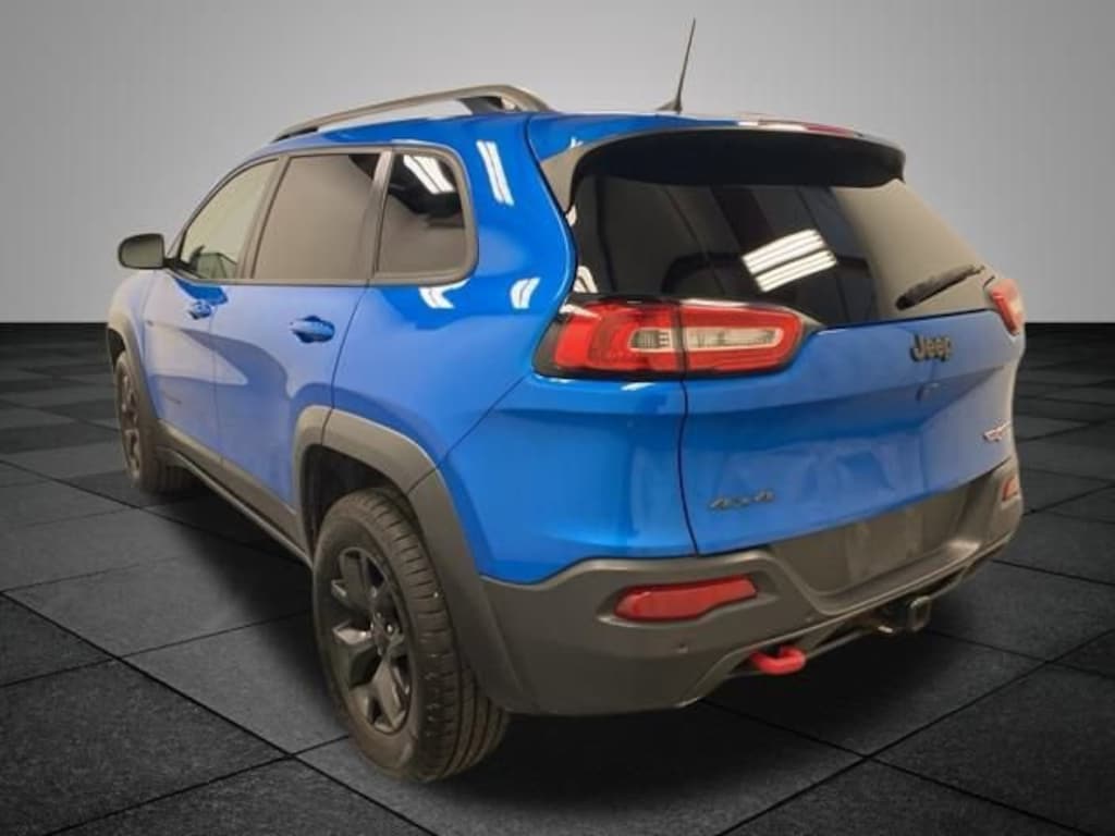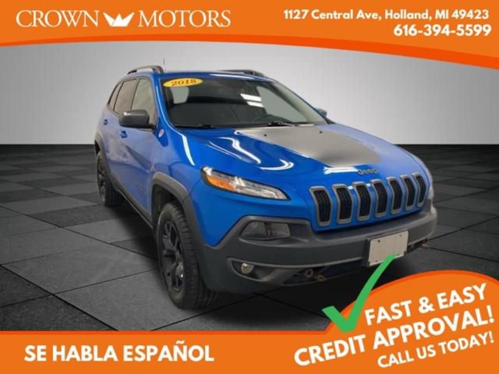 Hydro Blue Pearlcoat 2018 Jeep Cherokee Trailhawk 4WD 9-Speed Automatic 3.2L V6 3.517 Axle Ratio, Quick Order Package 27E, 17" x 7.5" Aluminum Wheels, 4-Wheel Disc Brakes, 4.083 Axle Ratio, 6 Speakers, 600 Amp Maintenance Free Battery, 8.4" Touchscreen Display, ABS brakes, Air Conditioning, Alloy wheels, AM/FM radio: SiriusXM, Anti-whiplash front head restraints, Automatic temperature control, Auxiliary Transmission Oil Cooler, Brake assist, Cloth/Leather/Vinyl Bucket Seats, Compass, Delay-off headlights, Driver door bin, Driver vanity mirror, Dual front impact airbags, Dual front side impact airbags, Electronic Stability Control, Emergency communication system: Uconnect Access, Engine Oil Cooler, Exterior Mirrors Courtesy Lamps, Exterior Mirrors w/Supplemental Signals, Four wheel independent suspension, Front anti-roll bar, Front Bucket Seats, Front Center Armrest, Front dual zone A/C, Front fog lights, Front License Plate Bracket, Front reading lights, Fully automatic headlights, GPS Antenna Input, Heated door mirrors, High intensity discharge headlights: Bi-Xenon, Illuminated entry, Integrated Voice Command w/Bluetooth, Knee airbag, Leather Shift Knob, Low tire pressure warning, Manufacturer's Statement of Origin, Occupant sensing airbag, Off Road Suspension, Outside temperature display, Overhead airbag, Overhead console, Panic alarm, ParkView Rear Back-Up Camera, Passenger door bin, Passenger vanity mirror, Power door mirrors, Power driver seat, Power steering, Power windows, Radio data system, Radio: Uconnect 3C w/8.4" Display, Rear anti-roll bar, Rear reading lights, Rear seat center armrest, Rear side impact airbag, Rear window defroster, Rear window wiper, Remote keyless entry, Roof rack: rails only, SiriusXM Satellite Radio, Speed control, Speed-sensing steering, Split folding rear seat, Spoiler, Steering wheel mounted audio controls, Tachometer, Telescoping steering wheel, Tilt steering wheel, Traction control, Trip computer, Turn signal indicator mirrors, Uconnect Access, Variably intermittent wipers, Voltmeter, Wheels: 17" x 7.5" Black Painted Aluminum, 3.517 Axle Ratio, Quick Order Package 27E.