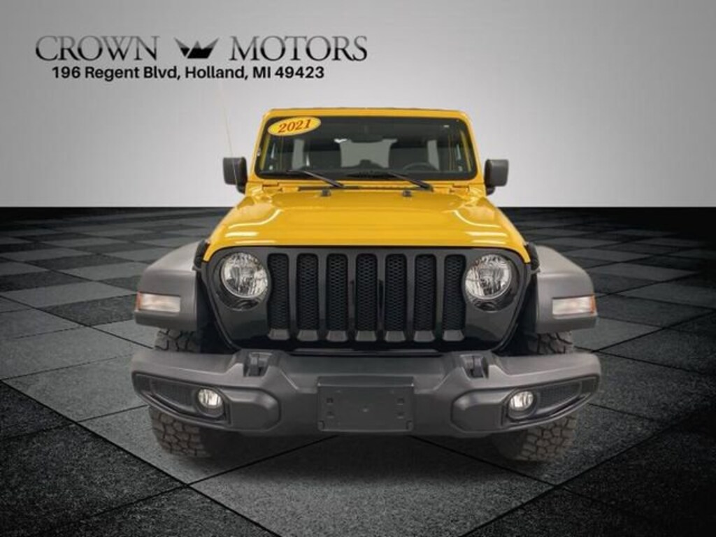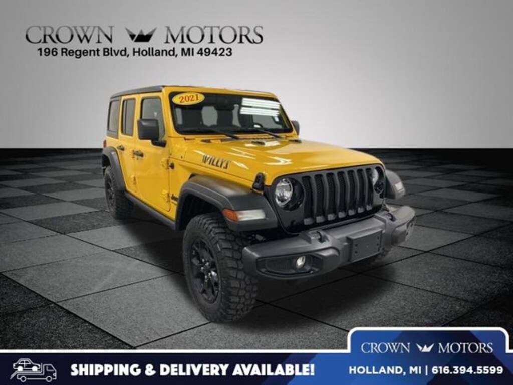 CLOSEOUT PRICING!!! VEHICLE IN INVENTORY UNTIL 9/30/25!!! CARFAX One-Owner. Clean CARFAX. Baja Yellow Clearcoat 2021 Jeep Wrangler Unlimited Willys 4WD 8-Speed Automatic 3.6L V6 24V VVT 4-Wheel Drive Swing Gate Decal, Anti-Spin Differential Rear Axle, Black Grille, Black Trail Rated Badge, Deep Tint Sunscreen Windows, Matte Black Jeep Badge, Mold In Color Bumper w/Gloss Black, MOPAR All-Weather Floor Mats (DISC), Quick Order Package 25K Willys Sport (DISC), Wheels: 17" x 7.5" Moab Black Aluminum, Willys, Willys Hood Decal, Wrangler Decal, 3.45 Rear Axle Ratio, 4-Wheel Disc Brakes, 8 Speakers, ABS brakes, Air Conditioning, AM/FM radio, Aux Battery, Black 3-Piece Hard Top, Brake assist, Cloth Low-Back Bucket Seats, Compass, Delay-off headlights, Driver door bin, Driver vanity mirror, Dual front impact airbags, Dual front side impact airbags, Electronic Stability Control, For More Info, Call 800-643-2112, Freedom Panel Storage Bag, Front anti-roll bar, Front Bucket Seats, Front Center Armrest w/Storage, Front fog lights, Front reading lights, Integrated roll-over protection, Low tire pressure warning, No Soft Top, Non-Lock Fuel Cap w/o Discriminator, Normal Duty Suspension, Occupant sensing airbag, Outside temperature display, ParkView Rear Back-Up Camera, Passenger door bin, Passenger vanity mirror, Power steering, Radio data system, Radio: Uconnect 3 w/5" Display, Rear anti-roll bar, Rear reading lights, Rear Window Defroster, Rear Window Wiper/Washer, SiriusXM Radio Service, SiriusXM Satellite Radio, Speed control, Split folding rear seat, Steering wheel mounted audio controls, Stop-Start Dual Battery System, Tachometer, Telescoping steering wheel, Tilt steering wheel, Traction control, Trip computer, Variably intermittent wipers, Wheels: 17" x 7.5" Black Steel Styled, 4-Wheel Drive Swing Gate Decal, Anti-Spin Differential Rear Axle, Black Grille, Black Trail Rated Badge, Deep Tint Sunscreen Windows, Matte Black Jeep Badge, Mold In Color Bumper w/Gloss Black, MOPAR All-Weather Floor Mats (DISC), Quick Order Package 25K Willys Sport (DISC), Wheels: 17" x 7.5" Moab Black Aluminum, Willys, Willys Hood Decal, Wrangler Decal.