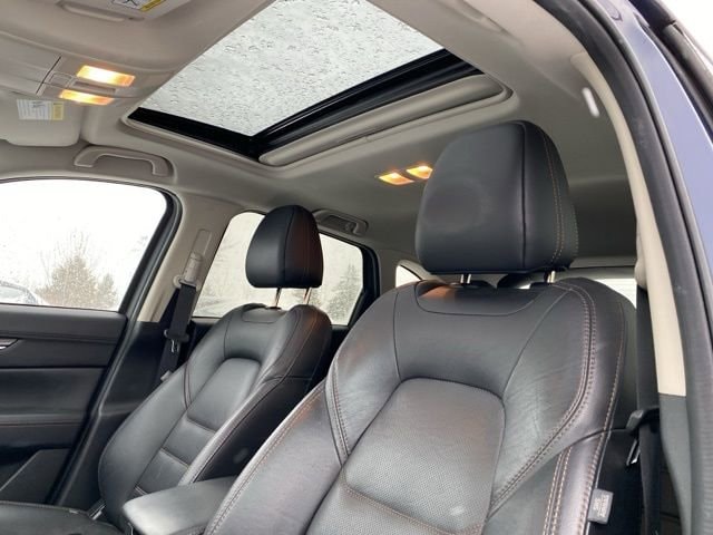 Clean CARFAX. Deep Crystal Blue Mica 2022 Mazda CX-5 2.5 S Premium Package AWD 6-Speed Automatic SKYACTIV® 2.5L 4-Cylinder DOHC 16V 4-Wheel Disc Brakes, 4.624 Axle Ratio, 6 Speakers, ABS brakes, Air Conditioning, Alloy wheels, AppLink/Apple CarPlay and Android Auto, Auto High-beam Headlights, Auto-dimming Rear-View mirror, Automatic temperature control, Bose Audio Credit, Brake assist, Bumpers: body-color, Cargo Mat, Delay-off headlights, Driver door bin, Driver vanity mirror, Dual front impact airbags, Dual front side impact airbags, E911 Automatic Emergency Notification, Electronic Stability Control, Emergency communication system: MAZDA CONNECT, Exterior Parking Camera Rear, Four wheel independent suspension, Front anti-roll bar, Front Bucket Seats, Front Center Armrest w/Storage, Front dual zone A/C, Front reading lights, Fully automatic headlights, Garage door transmitter: HomeLink, Heated door mirrors, Heated Front Bucket Seats, Heated front seats, Illuminated entry, Infotainment System Voice Command, Leather Seat Trim, Leather Shift Knob, Low tire pressure warning, Memory seat, Multifunction Commander Control, Occupant sensing airbag, Outside temperature display, Overhead airbag, Overhead console, Pandora, Panic alarm, Passenger door bin, Passenger vanity mirror, Power door mirrors, Power driver seat, Power Liftgate Credit, Power moonroof, Power passenger seat, Power steering, Power windows, Premium audio system: Bose, Radio Broadcast Data System Program Information, Radio data system, Radio: AM/FM/HD Audio System, Rain sensing wipers, Rear anti-roll bar, Rear reading lights, Rear seat center armrest, Rear window defroster, Rear window wiper, Remote keyless entry, SMS Text Msg Audio Delivery & Reply, Speed control, Speed-sensing steering, Split folding rear seat, Spoiler, Steering wheel mounted audio controls, Tachometer, Telescoping steering wheel, Tilt steering wheel, Traction control, Trip computer, Turn signal indicator mirrors, Variably intermittent wipers, Wheels: 19" x 7J Aluminum Alloy.