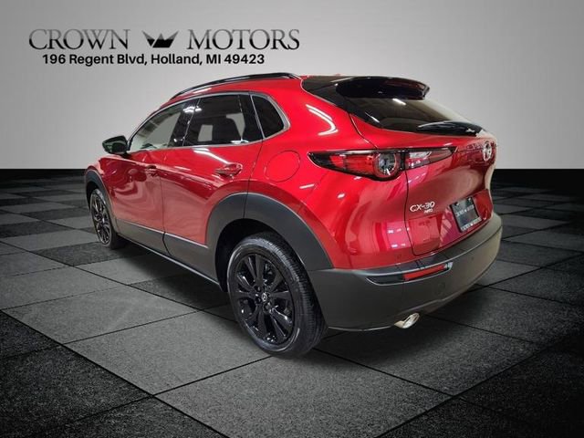 Clean CARFAX. Certified. Soul Red Crystal Metallic 2025 Mazda CX-30 2.5 Turbo Premium Plus Package w/Premium Plus Package AWD 6-Speed Automatic 2.5L I4 **ONE OWNER**, ** LOW MILES**, **MAZDA CERTIFIED**, **ACCIDENT FREE**, Mazda Certified Pre-Owned Certified, AWD, 12 Speakers, 4-Wheel Disc Brakes, ABS brakes, Air Conditioning, Alloy wheels, AM/FM radio: SiriusXM, AppLink/Apple CarPlay and Android Auto, Auto High-beam Headlights, Auto-dimming door mirrors, Auto-dimming Rear-View mirror, Automatic temperature control, Black Lug Nuts & Black Wheel Locks, Brake assist, Bumpers: body-color, Compass, Delay-off headlights, Driver door bin, Driver vanity mirror, Dual front impact airbags, Dual front side impact airbags, Electronic Stability Control, Emergency communication system: Mazda Connected Services (3-year trial subscription included), Front anti-roll bar, Front Bucket Seats, Front Center Armrest, Front dual zone A/C, Front reading lights, Front wheel independent suspension, Fully automatic headlights, Garage door transmitter: HomeLink, Heads-Up Display, Heated door mirrors, Heated Front Bucket Seats, Heated front seats, Heated steering wheel, Illuminated entry, Knee airbag, Leather Seat Trim, Leather Shift Knob, Leather steering wheel, Low tire pressure warning, MAZDA CONNECT Infotainment System, Memory seat, Navigation system: MAZDA CONNECT, Occupant sensing airbag, Outside temperature display, Overhead airbag, Overhead console, Panic alarm, Passenger door bin, Passenger vanity mirror, Power door mirrors, Power driver seat, Power Liftgate, Power moonroof, Power steering, Power windows, Radio data system, Radio: AM/FM/HD Audio w/Mazda Online Navigation, Rain sensing wipers, Rear seat center armrest, Rear side impact airbag, Rear window defroster, Rear window wiper, Remote keyless entry, Soul Red Crystal Metallic Paint Charge, Speed control, Speed-sensing steering, Split folding rear seat, Spoiler, Steering wheel mounted audio controls, Tachometer, Telescoping steering wheel, Tilt steering wheel, Traction control, Trip computer, Turn signal indicator mirrors, Variably intermittent wipers, Wheels: 18" x 7J Aluminum Alloy, AWD.