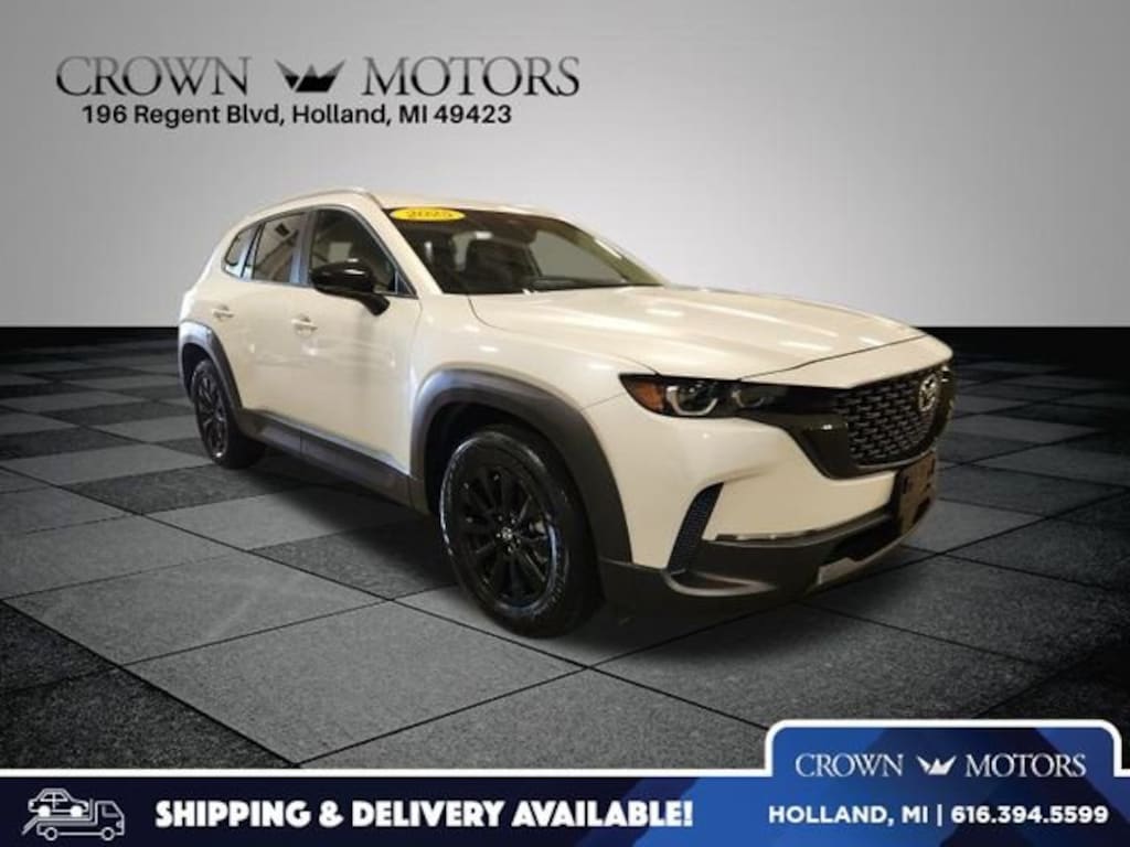 CARFAX One-Owner. Pearl 2025 Mazda CX-50 2.5 S Preferred Package AWD 6-Speed Automatic SKYACTIV® 2.5L 4-Cylinder DOHC 16V **MAZDA CERTIFIED**, CX-50 2.5 S Preferred Package, AWD, 4-Wheel Disc Brakes, 8 Speakers, ABS brakes, Air Conditioning, Alloy wheels, AM/FM radio, AppLink/Apple CarPlay and Android Auto, Auto High-beam Headlights, Automatic temperature control, Brake assist, Bumpers: body-color, Delay-off headlights, Driver door bin, Driver vanity mirror, Dual front impact airbags, Dual front side impact airbags, E911 Automatic Emergency Notification, Electronic Stability Control, Emergency communication system: MAZDA CONNECT, Exterior Parking Camera Rear, Front anti-roll bar, Front Bucket Seats, Front Center Armrest, Front dual zone A/C, Front reading lights, Front wheel independent suspension, Fully automatic headlights, Half Leatherette Seat Trim, Heated door mirrors, Heated Front Bucket Seats, Heated front seats, Illuminated entry, Infotainment System Voice Command, Knee airbag, Leather Shift Knob, Leather steering wheel, Low tire pressure warning, Multifunction Commander Control, Occupant sensing airbag, Outside temperature display, Overhead airbag, Overhead console, Panic alarm, Passenger door bin, Passenger vanity mirror, Power door mirrors, Power driver seat, Power Liftgate, Power steering, Power windows, Radio Broadcast Data System Program Information, Radio data system, Radio: AM/FM/HD Audio System, Rain sensing wipers, Rear seat center armrest, Rear window defroster, Rear window wiper, Remote keyless entry, SMS Text Msg Audio Delivery & Reply, Speed control, Speed-sensing steering, Split folding rear seat, Spoiler, Steering wheel mounted audio controls, Tachometer, Telescoping steering wheel, Tilt steering wheel, Traction control, Trip computer, Turn signal indicator mirrors, Variably intermittent wipers, Wheels: 17" x 7J Aluminum Alloy, Wind Chill Pearl Paint Charge, CX-50 2.5 S Preferred Package, AWD.