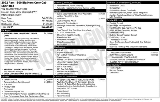 CLOSEOUT PRICING!!! VEHICLE IN INVENTORY UNTIL 12/31/25!!! CARFAX One-Owner. Bright White Clearcoat 2022 Ram 1500 Big Horn/Lone Star 4WD 8-Speed Automatic HEMI 5.7L V8 Multi Displacement VVT 115V Auxiliary Power Outlet, 115V Auxiliary Rear Power Outlet, 2nd Row In Floor Storage Bins, 4G LTE Wi-Fi Hot Spot, 8.4" Touchscreen Display, Air Conditioning ATC w/Dual Zone Control, Apple CarPlay, Auto-Dimming Exterior Driver Mirror, Auto-Dimming Rear-View Mirror, Big Horn Badge, Big Horn Level 2 Equipment Group, Black Exterior Mirrors, Black Premium Power Mirrors, Bluetooth Handsfree Phone & Audio, Class IV Receiver Hitch, Cluster 7.0" TFT Color Display, Connectivity - US/Canada, Convex Wide-Angle Mirror Insert, Exterior Mirrors Courtesy Lamps, Exterior Mirrors w/Heating Element, Exterior Mirrors w/Supplemental Signals, For Details, Visit DriveUconnect.com, Front LED Fog Lamps, Global Telematics Box Module (TBM), Glove Box Lamp, Google Android Auto, GPS Antenna Input, GPS Navigation, Heated Front Seats, Heated Steering Wheel, Integrated Center Stack Radio, LED Reflector Headlamps, LED Taillamps, Media Hub w/2 Charge Only USBs, ParkSense Front/Rear Park Assist w/Stop, Power 2-Way Driver Lumbar Adjust, Power 8-Way Driver Seat, Power Adjustable Pedals, Power-Folding Mirrors, Premium Lighting Group, Quick Order Package 27Z Big Horn, Radio: Uconnect 5 W w/8.4" Display, Rear Dome w/On/Off Switch Lamp, Rear Power Sliding Window, Rear Window Defroster, Remote Start System, Security Alarm, SiriusXM Radio Service, SiriusXM Satellite Radio, Sun Visors w/Illuminated Vanity Mirrors, Universal Garage Door Opener, USB Host Flip, 3 Rear Seat Head Restraints, 3.21 Rear Axle Ratio, 4 Way Front Headrests, 4-Wheel Disc Brakes, 400W Inverter, 48V Belt Starter Generator, 6 Speakers, ABS brakes, Air Conditioning, All R1 High Radios, All Radio Equipped Vehicles, Alloy wheels, AM/FM radio, Brake assist, Bumpers: chrome, Cloth Bench Seat, Compass, Connected Travel & Traffic Services, Delay-off headlights, Disassociated Touchscreen Display, Dome Dual LED Reading Lamp, Driver door bin, Dual front impact airbags, Dual front side impact airbags, Dual-Pane Panoramic Sunroof, Electronic Stability Control, Emergency communication system: SiriusXM Guardian, Front anti-roll bar, Front Center Armrest w/Storage, Front fog lights, Front reading lights, Front Seat Back Map Pockets, Front wheel independent suspension, Fully automatic headlights, HD Radio, Heated door mirrors, Illuminated entry, Integrated Voice Command w/Bluetooth, Leather steering wheel, Low tire pressure warning, Manufacturer's Statement of Origin, MOPAR Front & Rear Rubber Floor Mats, Occupant sensing airbag, Outside temperature display, Overhead airbag, Overhead console, Overhead LED Lamps, Panic alarm, ParkView Rear Back-Up Camera, Passenger door bin, Passenger vanity mirror, Power door mirrors, Power steering, Power windows, Premium Overhead Console, Radio data system, Radio: Uconnect 3 w/5" Display, Radio: Uconnect 5 Nav w/8.4" Display, Rear 60/40 Folding Seat, Rear anti-roll bar, Rear seat center armrest, Rear step bumper, Rear Wheelhouse Liners, Remote keyless entry, SiriusXM w/360L, Speed control, Split folding rear seat, Steering wheel mounted audio controls, Tachometer, Telescoping steering wheel, Tilt steering wheel, Traction control, Trailer Brake Control, Trip computer, Variably intermittent wipers, Voltmeter, Wheels: 18" x 8" Cast-Aluminum Painted, Wheels: 20" x 9" Aluminum Chrome Clad (WRK), 115V Auxiliary Power Outlet, 115V Auxiliary Rear Power Outlet, 2nd Row In Floor Storage Bins, 4G LTE Wi-Fi Hot Spot, 8.4" Touchscreen Display, Air Conditioning ATC w/Dual Zone Control, Apple CarPlay, Auto-Dimming Exterior Driver Mirror, Auto-Dimming Rear-View Mirror, Big Horn Badge, Big Horn Level 2 Equipment Group, Black Exterior Mirrors, Black Premium Power Mirrors, Bluetooth Handsfree Phone & Audio, Class IV Receiver Hitch, Cluster 7.0" TFT Color Display